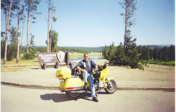 Here's one picture of me takin it easy on my first Gold Wing at my first Bike Week in 2002. Here's another picture of the same Goldwing after having it painted Corvette Yellow. This picture was taken on my trip to Yellow Stone National Park and the Grand Tetons in July of 2002 that Stan and I did. Old Yeller. 5,010 miles and 15 states round trip.