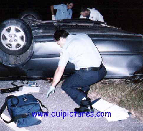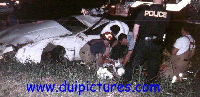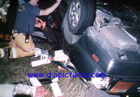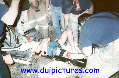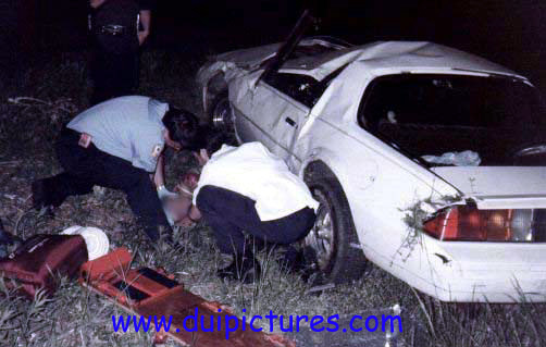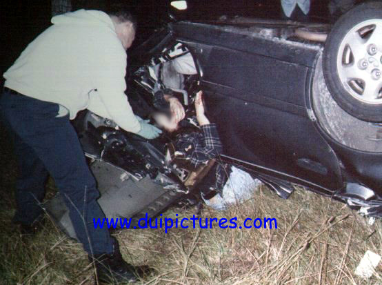 Here's a few pics of one wreck that involved an intoxicated driver that was also driving recklessly. (Intoxicated people tend to do this). The first picture is of the passenger that was sleeping with the seat reclined in a vehicle that was traveling at about 115 mph that struck a tractor trailer in the rear that was doing about 60 mph. The top of the vehicle was sheared off during the impact. This person was lucky to be laying down or they would have been in two places at one time. The vehicle ended up upside down on top of the driver, pinning their face to the asphalt. It took about 30 minutes to finally get the car raised enough so the medics could get to the driver. Can you say Bud Light? From what I understand, they were college students coming back from a big party after going to a baseball game in Atlanta.