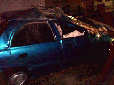 01-25-03 we received another call to a vehicle accident. The vehicle flipped two times after the young man driving it attempted to send a "text" message on his cell phone while driving. First two pictures are of the vehicle he was in. He had his seat belts on and as a result, he did not have a scratch, yet his vehicle was a total loss. You can replace a vehicle, but no one can replace YOU!
